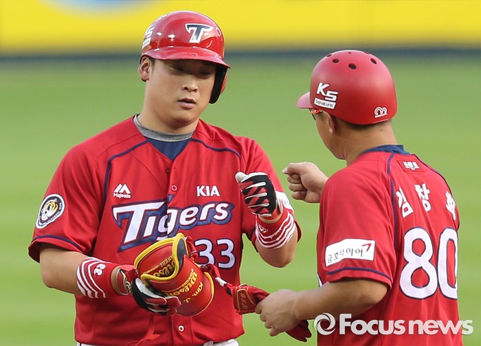 (서울=포커스뉴스) 10일 서울 잠실구장에서 열린 2016 프로야구 KIA-두산 경기 1회초 2사 1,3루에서 KIA 김주형이 1타점 우중간 2루타를 치고 2루에서 김창희 코치의 축하를 받고 있다.