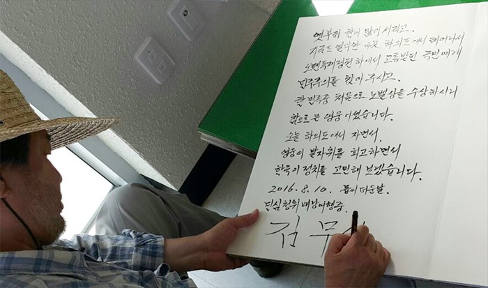 (서울=포커스뉴스) 전국 민심투어를 재개한 김무성 새누리당 전 대표가 10일 오후 전남 신안군 하의도 故 김대중 전 대통령 생가를 방문해 방명록을 작성하고 있다. <사진제공=김무성 전 대표 페이스북>