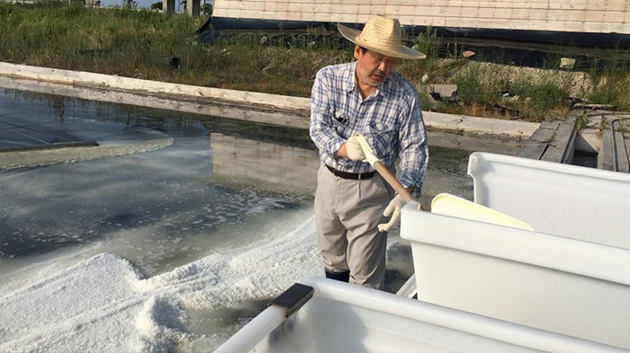 (서울=포커스뉴스) 전국 민심투어를 재개한 김무성 새누리당 전 대표가 10일 오후 전남 신안군 하의도를 방문해 염전 체험을 하고 있다. <사진제공=김무성 전 대표 페이스북>