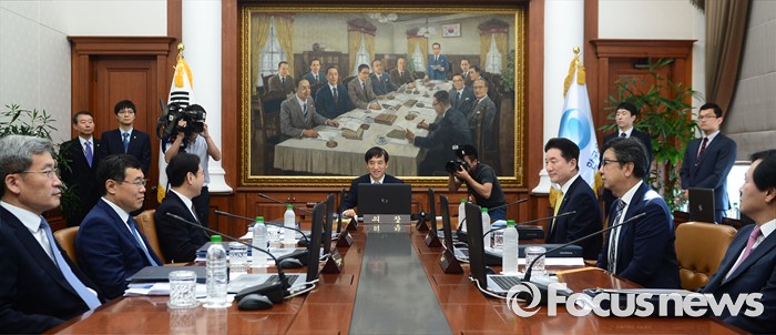 (서울=포커스뉴스) 이주열(가운데) 한국은행 총재가 11일 오전 서울 중구 한국은행에서 열린 제15차 금융통화위원회에 참석해 있다.