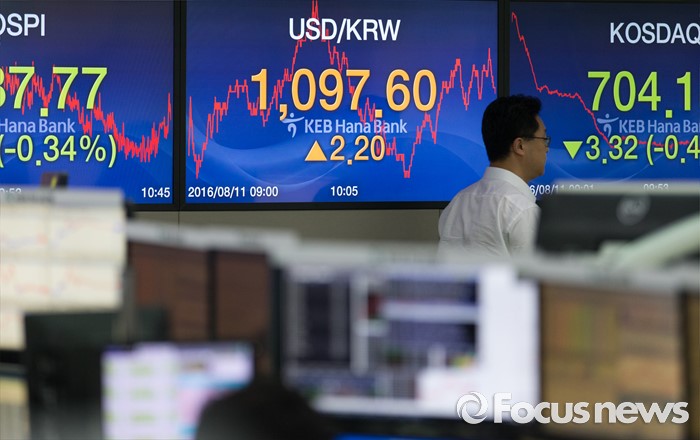(서울=포커스뉴스) 11일 오전 서울 중구 KEB 하나은행 딜링룸에서 한 딜러가 업무를 보고 있다.