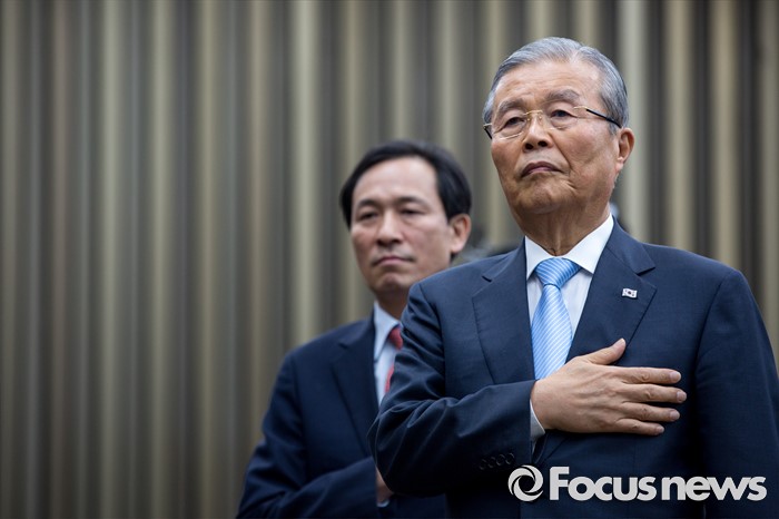 (서울=포커스뉴스) 김종인 더불어민주당 비상대책위 대표와 우상호 원내대표가 11일 오전 서울 여의도 국회에서 열린 의원총회에 참석해 국민의례하고 있다.