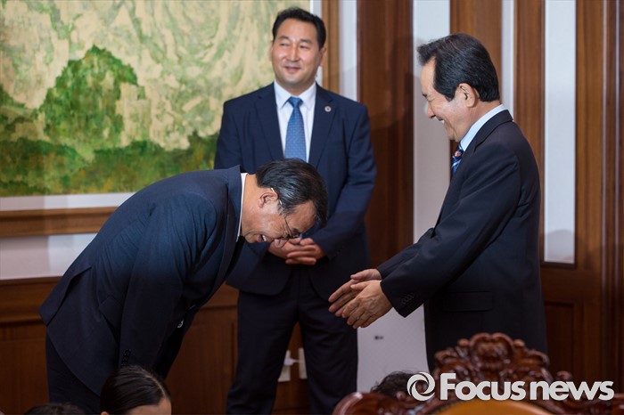 (서울=포커스뉴스) 이정현(왼쪽) 새누리당 대표가 11일 오후 서울 여의도 국회에서 정세균 국회의장을 예방해 면담에 앞서 인사 하고 있다.