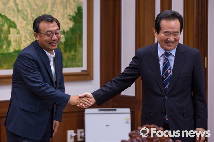 (서울=포커스뉴스) 이정현(왼쪽) 새누리당 대표가 11일 오후 서울 여의도 국회에서 정세균 국회의장을 예방해 인사를 나눈 뒤 자리로 이동 하고 있다.