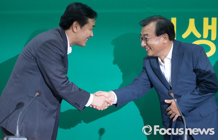 (서울=포커스뉴스) 11일 오후 서울 여의도 국회에서 이정현(오른쪽) 새누리당 대표가 박지원 국민의당 비상대책위원장과의 면담에 앞서 김관영 원내수석부대표와 인사하고 있다.