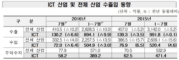 이달 ICT 수지는 58억2000만달러로 흑자를 기록했다.7월 ICT 수출입 동향.<표제공=미래부>