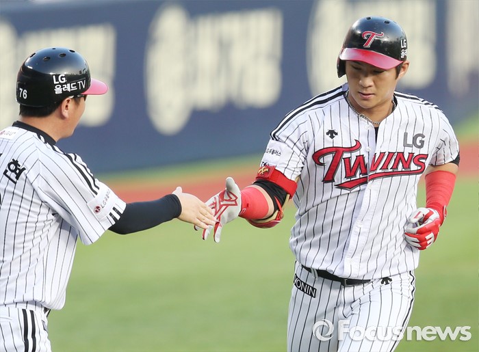 (서울=포커스뉴스) 11일 서울 잠실구장에서 열린 2016 프로야구 NC-LG 경기 2회말 1사후 LG 오지환이 우월 솔로 홈런을 치고 3루를 돌며 유지현 코치와 악수하고 있다.