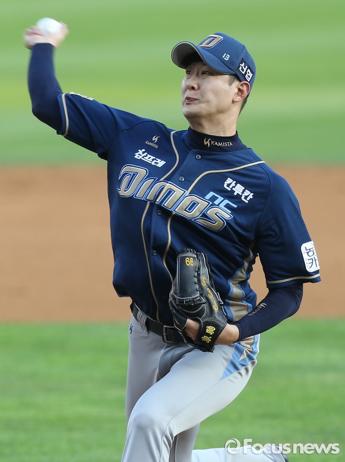 (서울=포커스뉴스) 11일 서울 잠실구장에서 열린 2016 프로야구 NC-LG 경기에서 1회말 NC 선발투수 최금강이 투구하고 있다.