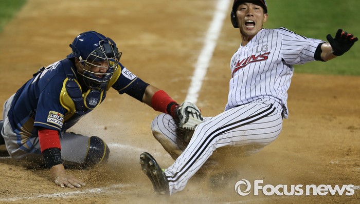 (서울=포커스뉴스) 11일 서울 잠실구장에서 열린 2016 프로야구 NC-LG 경기 5회말 선두타자로 나와 우익수 오른쪽에 떨어지는 3루타로 진루한 LG 김용의가 이천웅의 좌익수 희생플라이떄 홈으로 뛰어들어 세이프되고 있다.