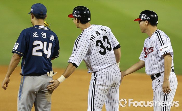 (서울=포커스뉴스) 11일 서울 잠실구장에서 열린 2016 프로야구 NC-LG 경기에서 KBO리그 통산 6번쨰 2천 안타를 기록한 LG 박용택이 NC 조영훈을 격려하고 있다. 한혁수 코치는 박용택을 격려하고...