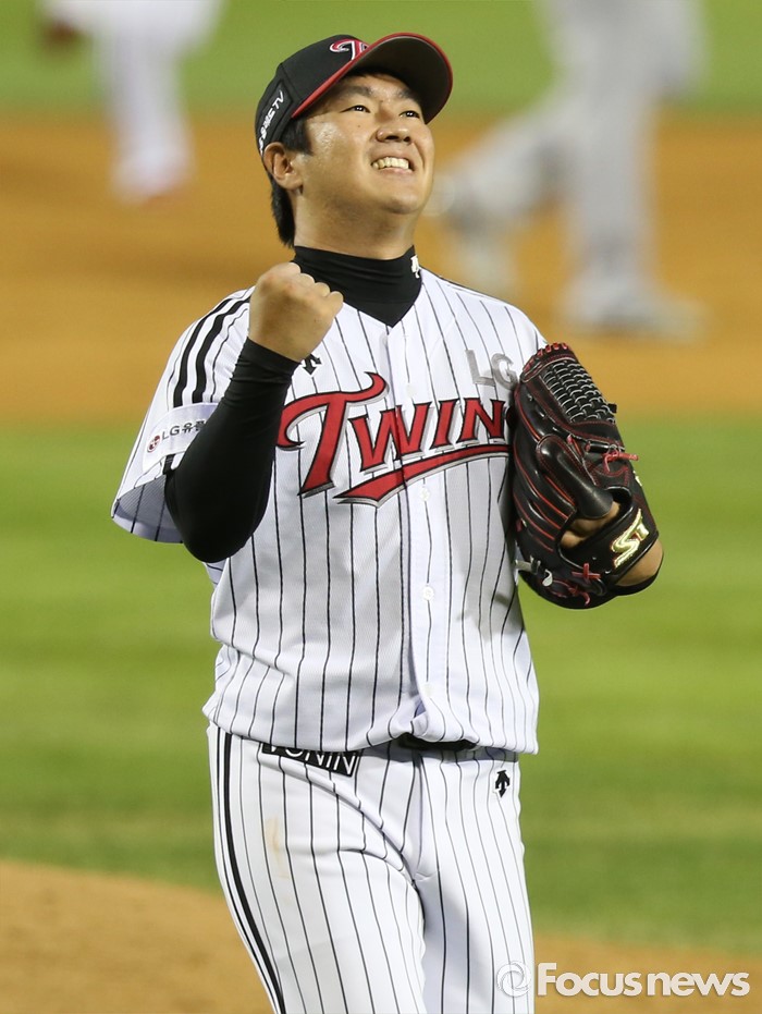 (서울=포커스뉴스) 11일 서울 잠실구장에서 열린 2016 프로야구 NC-LG 경기 7회초 2사 2,3루에서 LG 투수 김지용이 NC 모창민을 삼진 아웃으로 잡고 실점위기를 넘기며 주먹을 불끈 쥐며 기뻐하고 있다.