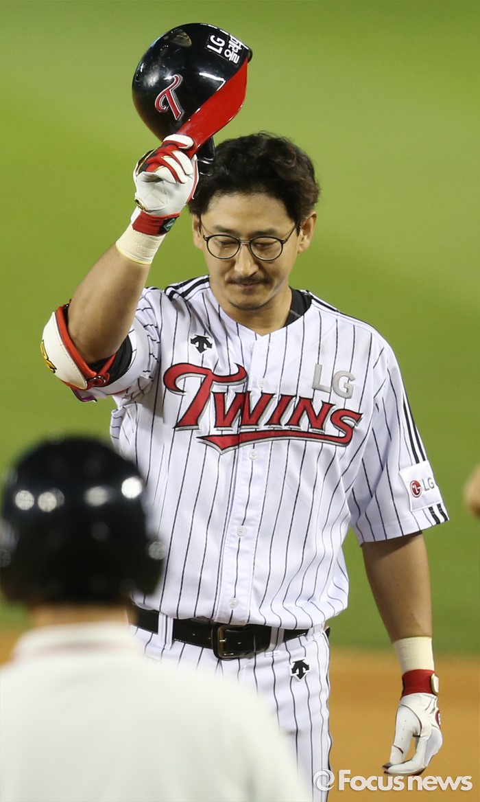 (서울=포커스뉴스) 11일 서울 잠실구장에서 열린 2016 프로야구 NC-LG 경기 7회말 2사후 LG 박용택이 우전 안타를 쳐 KBO리그 통산 6번쨰 2천 안타를 기록하고 1루에서 관중에게 헬멧을 벗어 인사하고 있다.