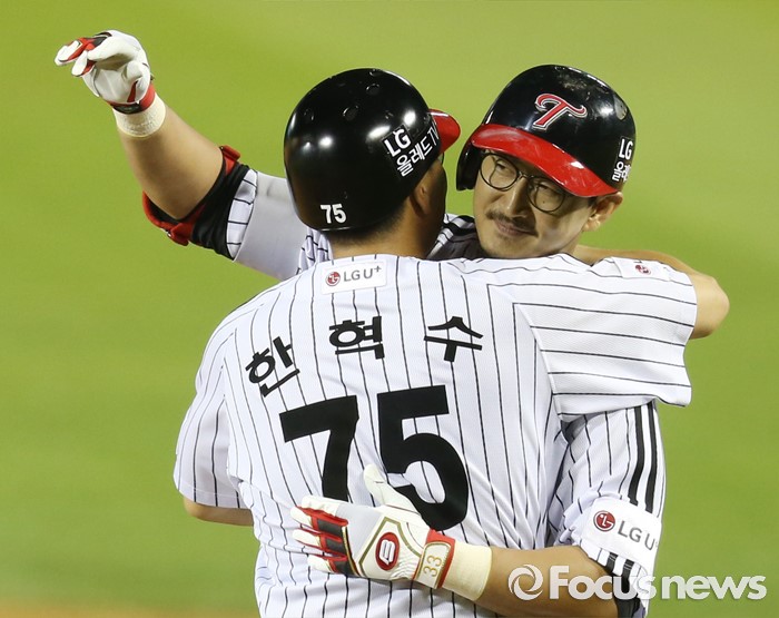 (서울=포커스뉴스) 11일 서울 잠실구장에서 열린 2016 프로야구 NC-LG 경기 7회말 2사후 LG 박용택이 우전 안타를 쳐 KBO리그 통산 6번쨰 2천 안타를 기록하고 1루에서 한혁수 코치와 포옹하고 있다.