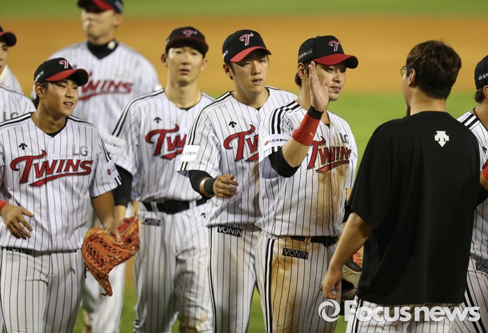 (서울=포커스뉴스) 11일 서울 잠실구장에서 열린 2016 프로야구 NC-LG 경기에서 NC에 4-2로 승리해 8연승을 한 LG 선수들이 그라운드에 모여 하이파이브하고 있다.