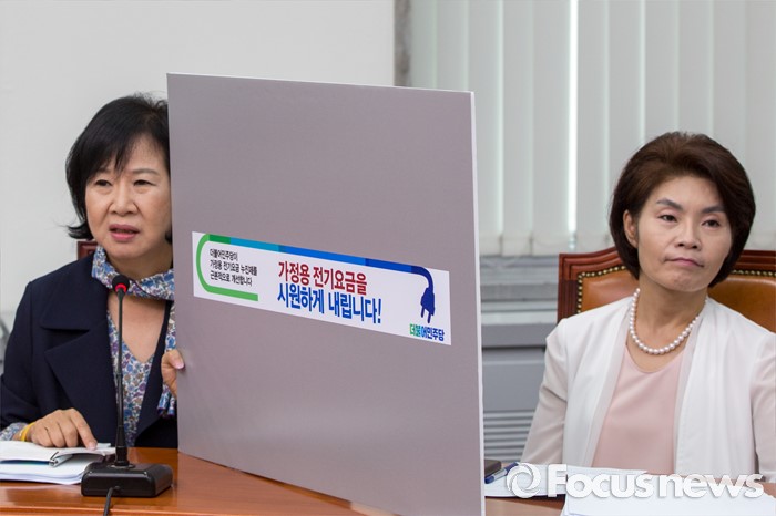 (서울=포커스뉴스) 손혜원(왼쪽) 더불어민주당 의원이 12일 오전 서울 여의도 국회에서 열린 비상대책위원회의에 참석해 전기요금 누진세 인하 관련 발언을 하고 있다.